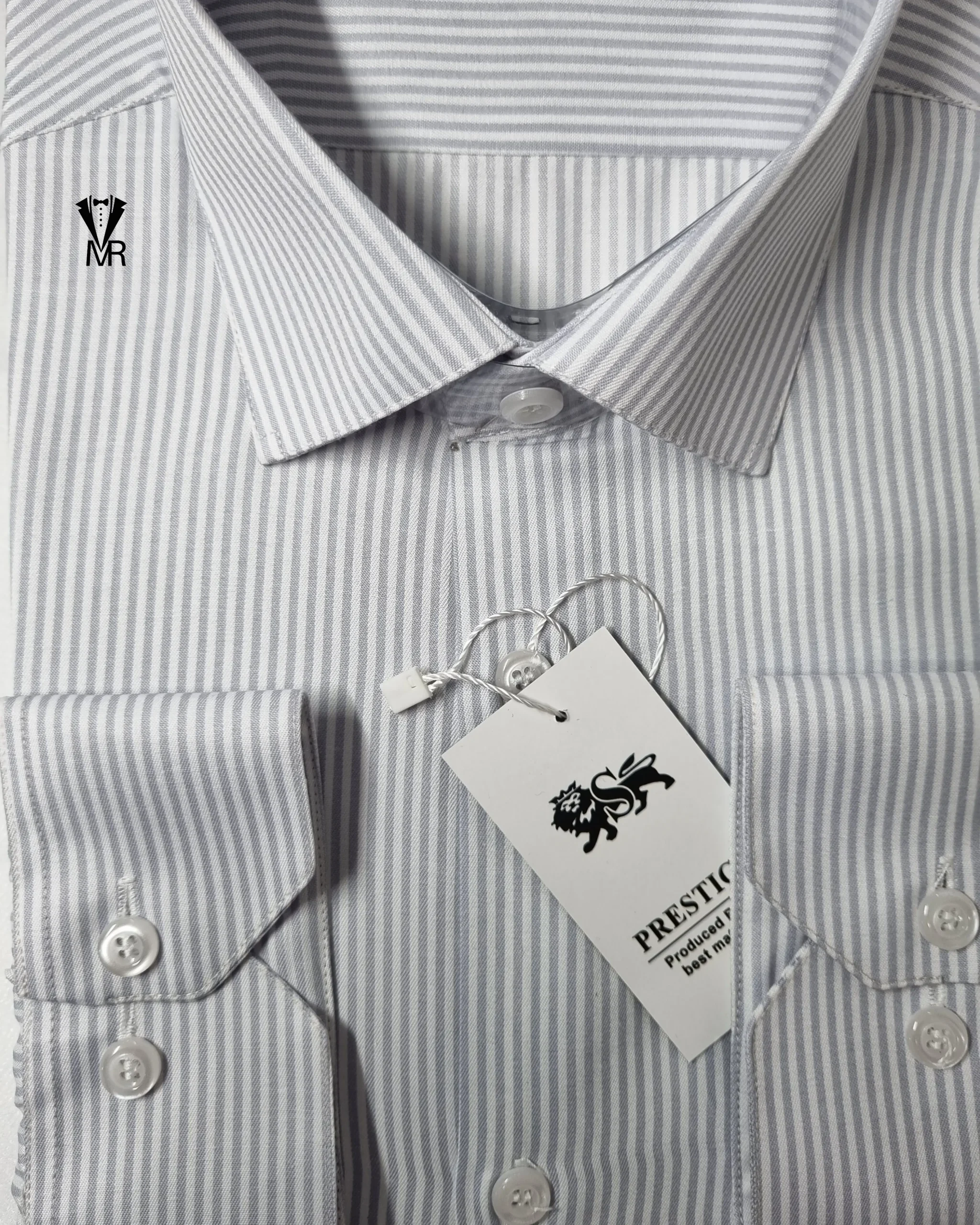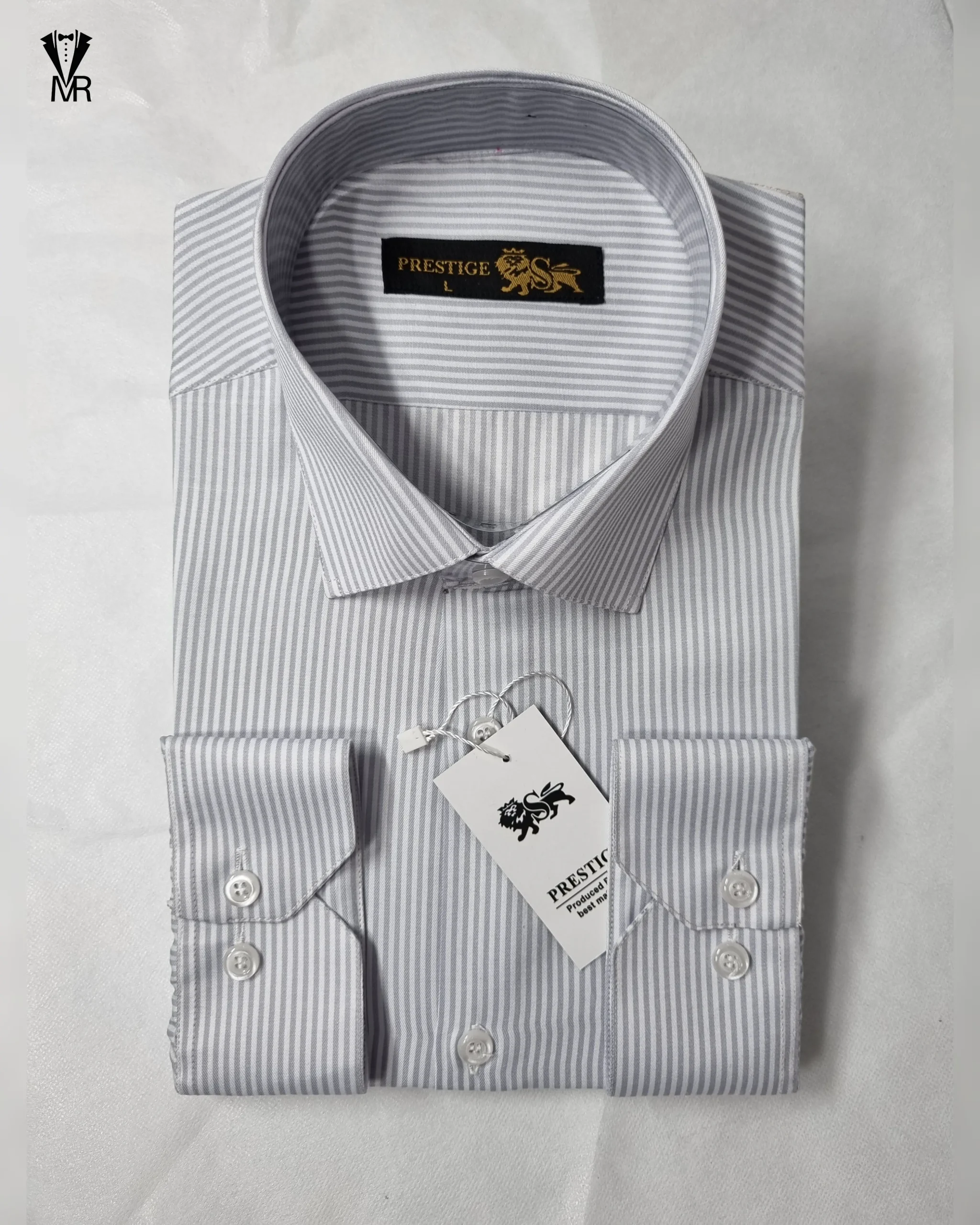 پیراهن حریر خط درشت سفید با خط طوسی روشن – انتخابی شیک و خوشاستایل برای آقایان خوشپوش